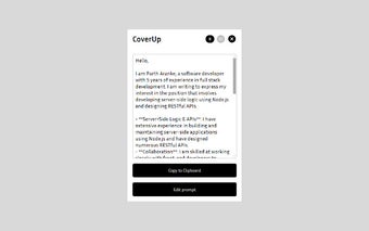 CoverUp เป็นส่วนเสริมของ Chrome ที่ออกแบบมาเพื่อช่วยผู้ใช้ในการสร้างจดหมายสมัครงานที่ปรับแต่งได้สำหรับการสมัครงานใน Upwork โดยใช้เทคโนโลยีของ OpenAI เครื่องมือนี้วิเคราะห์คำอธิบายงานเพื่อสร้างจดหมายสมัครงานที่เป็นส่วนตัวโดยอัตโนมัติ ทำให้กระบวนการสมัครงานมีประสิทธิภาพมากขึ้นและใช้เวลาน้อยลง ด้วยอินเทอร์เฟซที่ใช้งานง่าย ผู้ใช้สามารถนำทางฟีเจอร์ต่างๆ ได้อย่างง่ายดายโดยไม่ต้องมีการเรียนรู้ที่สูง ทำให้เข้าถึงได้สำหรับทุกระดับประสบการณ์.